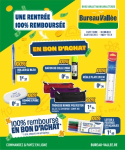 DU 02 JUILLET AU 08 JUILLET 2025 EN BON D’ACHAT 100% remboursé EN BON D’ACHAT * 1 SEUL PRODUIT PAR RÉFÉRENCE * COMMANDEZ & PAYEZ EN LIGNE BUREAU-VALLEE.RE UNE RENTRÉE 100% REMBOURSÉE GOMME EPURE MAPED BATON DE COLLE 20GR WONDAY RÈGLE PLATE 20 CM MAPED ROLLER G2 BLEU PILOT LOT DE 4 FEUTRES EFFAÇABLES GIOTTO TROUSSE RONDE POLYESTER 22,5 X 7,5 CM OPAK 1 COMP. NO EXACOMPTA 0€34 0€35 0€32 1€65 1€24 L’UNI TÉ 1€37