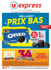 REJOIGNEZ-NOUS SU REJOIGNEZ-NOUS SUR : Votre pause PRIX BAS 1€, 89 LE PRODUIT BISCUIT ORIGINAL POCKET OREO Le paquet de 176g Le kg : 10,74 € -0€,50 DE REMISE IMMÉDIATE 2€,39A à Commerçants autrement DU MARDI 12 AU DIMANCHE 24 AOÛT 2025 JEUDIS PLUS LE 21 AOÛT 34%REVERSÉS SUR VOTRE CARTE U *Offre limitée à 10 produits identiques par compte Carte U. Jeudi plus, le jeudi 21 août 2025, Valable sur les bières avec ou sans alcool, panachés, chips et produits salés apéritifs (Biscuits apéritifs, cacahuètes, pistaches, fruits secs apéritifs, tuiles, tartinables, fruits à coque). Hors rayon produits du Monde, fruits secs du rayon traditionnel. Hors produits éligibles à un avantage promotionnel le jeudi 21 août 2025. Hors promotions en cours, hors produits bouclier qualité prix. Nous vous précisons qu'il y a le Jeudi Oui en magasin ce jeudi 21 août 2025, excepté sur les bières avec ou sans alcool, panachés, chips et produits salés apéritifs (Biscuits apéritifs, cacahuètes, pistaches, fruits secs apéritifs, tuiles, tartinables, fruits à coque). Offre réservée aux particuliers clients de la Carte U dans les Magasins U participants. Voir conditions en magasins. Votre magasin se réserve le droit de refuser une demande anormale au regard des quantités de produits habituellement constatées pour une consommation personnelle. Suggestion de présentation. L’ABUS D’ALCOOL EST DANGEREUX POUR LA SANTÉ, À CONSOMMER AVEC MODÉRATION. SUR LES BIÈRES, LES CHIPS ET LES PRODUITS SALÉS APÉRITIFS* HORS PROMOTIONS EN COURS Coopérative U. SA coopérative à capital variable. Parc Icade - 20 rue d’Arcueil - CS10043 - 94533 Rungis. R.C.S. 304 602 956 CRETEIL - Visuel non contractuel - Année 2025. POUR VOTRE SANTÉ, ÉVITEZ DE GRIGNOTER ENTRE LES REPAS. WWW.MANGERBOUGER.FR