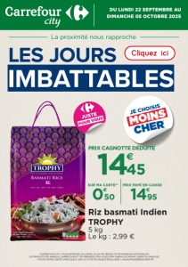 XXXXX XX XXXXX 20XX AU XXXXX XX XXXXX 20XX sont juste là LES PROMOS AVEC MA CARTE DE FIDÉLITÉ LES JOURS IMBATTABLES DU LUNDI 22 SEPTEMBRE AU DIMANCHE 05 OCTOBRE 2025 « POUR VOTRE SANTÉ, PRATIQUEZ UNE ACTIVITÉ PHYSIQUE RÉGULIÈRE » WWW.MANGERBOUGER.FR *CARREFOUR CITY VOUS PROPOSE UN LARGE CHOIX DE PRODUITS DE MARQUES NATIONALES, DE PRODUITS DE MARQUE CARREFOUR ET DE PREMIERS PRIX À DES PRIX PARMI LES MOINS CHERS DU MARCHÉ. La proximité nous rapproche MOINS * CHER JE CHOISIS SUR MA CARTE** PRIX PAYÉ EN CAISSE PRIX CAGNOTTE DÉDUITE 14€ 45 0€ 50 14€ 95 Riz basmati Indien TROPHY 5 kg Le kg : 2,99 €