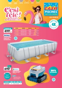 ALARME SAFE’O C-11-200022 DIMENSIONS 25,5 x 25,5 x 65 cm LEs + PRODUIT • Opérationnelle 24h/24 et 7j/7 • Conforme à la réglementation en vigueur Détecte en temps réel la chute ou l’immersion d’un corps dans votre piscine et vous alerte grâce à ses puissantes sirènes intégrées. 2 ANS GARANTIE 2 ANS OFFERTS PAR CASH PISCINES DOUCHE SOLAIRE PVC 25L C-11-208188 20% de remise 289€ 339€ PISCINE GONFLABLE RECTANGULAIRE C-11-000547 DIMENSIONS VOLUME D’EAU ÂGE 305 x 183 x 56 cm 1020 L À partir de 6 ans • Filtre à cartouche • Cartouche de filtration Type II INCLUS LEs + PRODUIT • 3 chambres à air • Bonde de vidange 39€ 59€ DIMENSIONS DÉBIT MINIMUM 1 CHAUFFAGE SOLAIRE 110 x 65 cm 4 m ³/h pour 10m³ LEs + PRODUIT • Gagnez jusqu’à 5°C • Système de chauffage écologique Possibilité d’installer plusieurs chauffages en série. CHAUFFAGE SOLAIRE C-11-002242 99€ 119€ 119€ 149€ AIRE DE JEUX GONFLABLE ALLIGATOR C-11-206942 • À partir de 3 ans • Volume d’eau : 160 L • Dimensions : 201 x 170 x 84 cm 39€ 59€ DÉCOUVREZ NOTRE LARGE OFFRE DE PIÈCES DÉTACHÉES