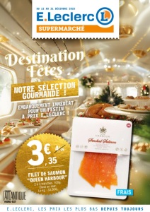 29 3€ ,99 1€ ,68 LE 1ER PRODUIT ACHETÉ LE 2e PRODUIT ACHETÉ -1€ ,91 SUR LE 2e PRODUIT ACHETÉ POMMES ÉTOILES SURGELÉES “FINDUS” 720g. Le kg : 4,99€. Par 2 (1,44kg) : 5,27€ au lieu de 7,18€. Le kg : 6,27€. Également disponible en variété POMMES DAUPHINE 540g Par 2 (1,08kg) : 6,07€ au lieu de 7,98€. Le kg : 5,62€. LES LÉGUMES SURGELÉS LES VIANDES SURGELÉES 29 LE « TICKET E.Leclerc COMPRIS » CORRESPOND AU PRIX AUQUEL REVIENDRAIT LE PRODUIT EN TENANT COMPTE DU MONTANT DU TICKET E.Leclerc. CRÉDITÉ SUR VOTRE CARTE DE FIDÉLITÉ ET UTILISABLE DÈS LE LENDEMAIN DE SON OBTENTION POUR LES PORTEURS DE LA CARTE DE FIDÉLITÉ E.Leclerc. LA CARTE EST GRATUITE ET DISPONIBLE IMMÉDIATEMENT. 11,99€ 11,99€ ORCHIDÉE (1) Pot de 1L. LES PLANTES LES FRUITS ET LÉGUMES 2, 49€ La pièce AVOCAT (2) Hass. Catégorie 1. Calibre 18/22. ANTHURIUM (1) Pot de 2L. REUNION (1) ORIGINE MAROC (2) ORIGINE PEROU (3) ORIGINE Du 22 au 24/12 À partir du 19/12 8,99€ Le pot de 500g MYRTILLES (3) 500g. Le pot. Le kg : 17,98€.