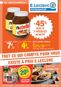 7€ ,33 4€ ,02 LE 1ER PRODUIT ACHETÉ LE 2e PRODUIT ACHETÉ -45% SUR LE 2e PRODUIT ACHETÉ PÂTE À TARTINER “NUTELLA” 1kg. Par 2 (2kg) : 11,35€ au lieu de 14,66€. Le kg : 5,68€. Soit le pot : 5,68€ pour l’achat de 2. HYPERMARCHÉ DU 27 JANVIER AU 08 FÉVRIER 2026 C’EST LA CHANDELEUR ! TOUT CE QUI COMPTE POUR VOUS EXISTE À PRIX E.LECLERC 20% Ticket E.Leclerc avec la Carte Sur les produits Marque Repère ! Pages 28 à 35 E.LECLERC, LES PRIX LES PLUS BAS DEPUIS TOUJOURS