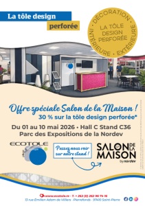 30 % sur la tôle design perforée* Offre spéciale Salon de la Maison ! Passez nous voir sur notre stand ! La tôle design perforée Décoration • Intérieure • extérieure • La tôle Design perforée Du 01 au 10 mai 2026 • Hall C Stand C36 Parc des Expositions de la Nordev © Générée via IA • Offre valable uniquement du 01 au 10 mai 2026 inclus, pour toute commande passée sur le stand du Salon de la Maison. www.ecotole.re · T. + 262 (0) 262 96 74 16 13 rue Émilien Adam de Villiers · Pierrefonds · 97410 Saint-Pierre